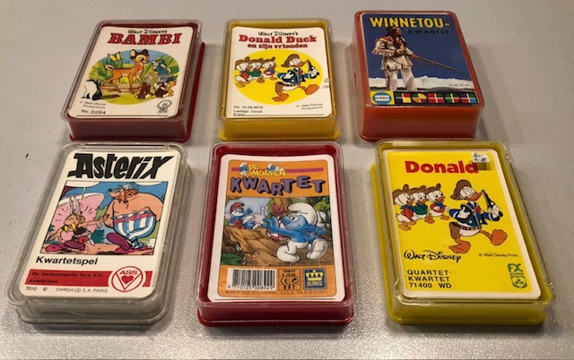 Veel vintage speelgoed, zoals deze prachtige kwartetspellen en grappige Disney poppetjes